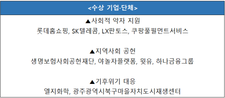 전문가 심사와 국민통합위원회 민간 위원들의 평가를 거쳐 ▲사회적 약자 지원 ▲지역사회 공헌 ▲기후 위기 대응 등 3개 분야에서 최종 10개 기업·단체가 수상했고, 사회적 약자 지원 부문에서 CFS가 아름다운 동행상을 받았습니다.