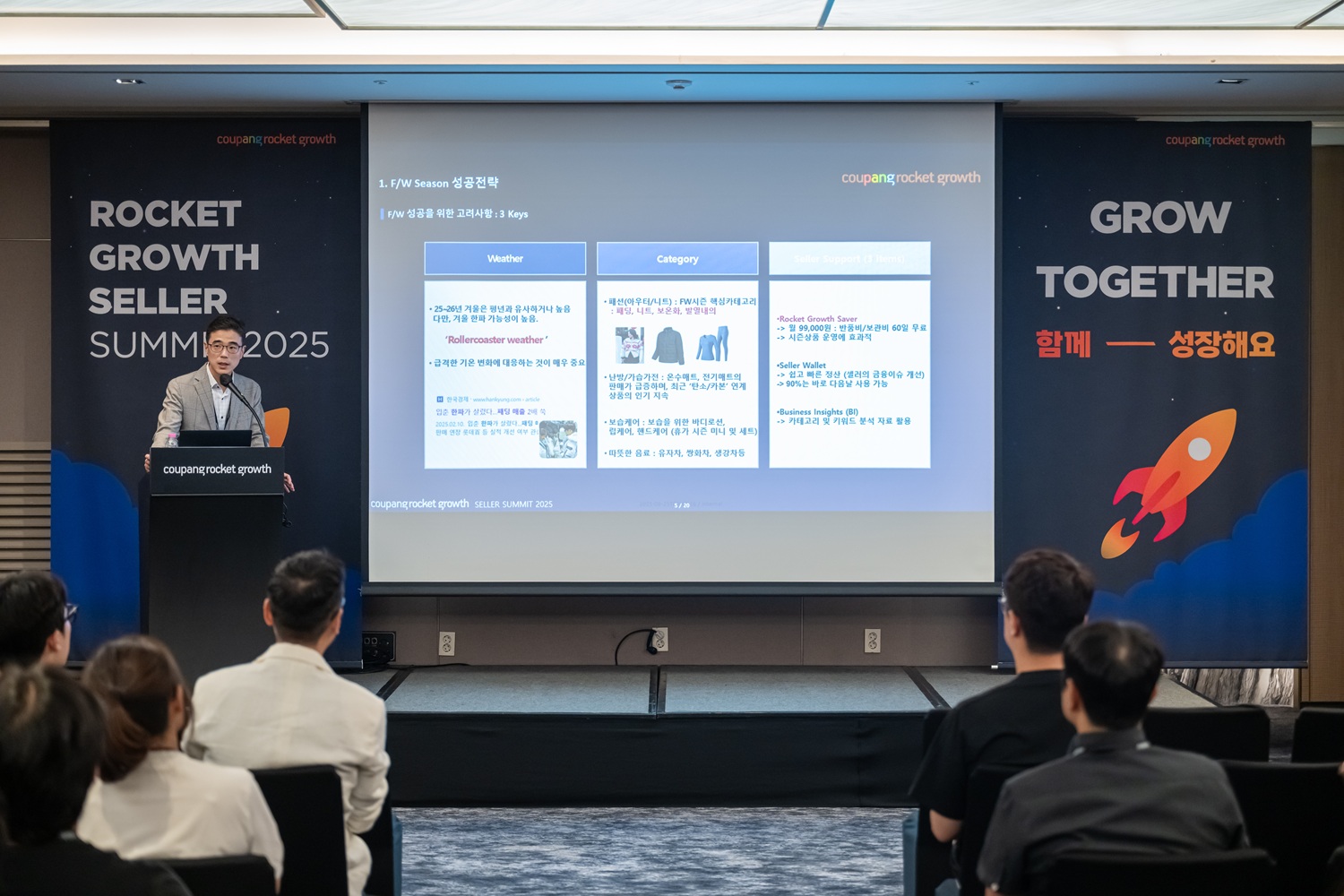 지난 9월 11일, 서울 JW메리어트호텔에서 ‘로켓그로스 판매자 써밋 2025’가 열렸습니다. 로켓그로스는 판매자가 상품을 등록해 입고하면, ▲보관, ▲재고 관리, ▲포장, ▲배송, ▲고객 응대, ▲교환 및 반품에 이르는 모든 물류 과정을 쿠팡이 대신 처리하는 원스톱 서비스입니다. 이번 행사는 로켓그로스 서비스를 활용해 성장하는 판매자분들을 지원하기 위해 마련됐습니다. 쿠팡 뉴스룸 팀이 그 현장에 다녀왔습니다.