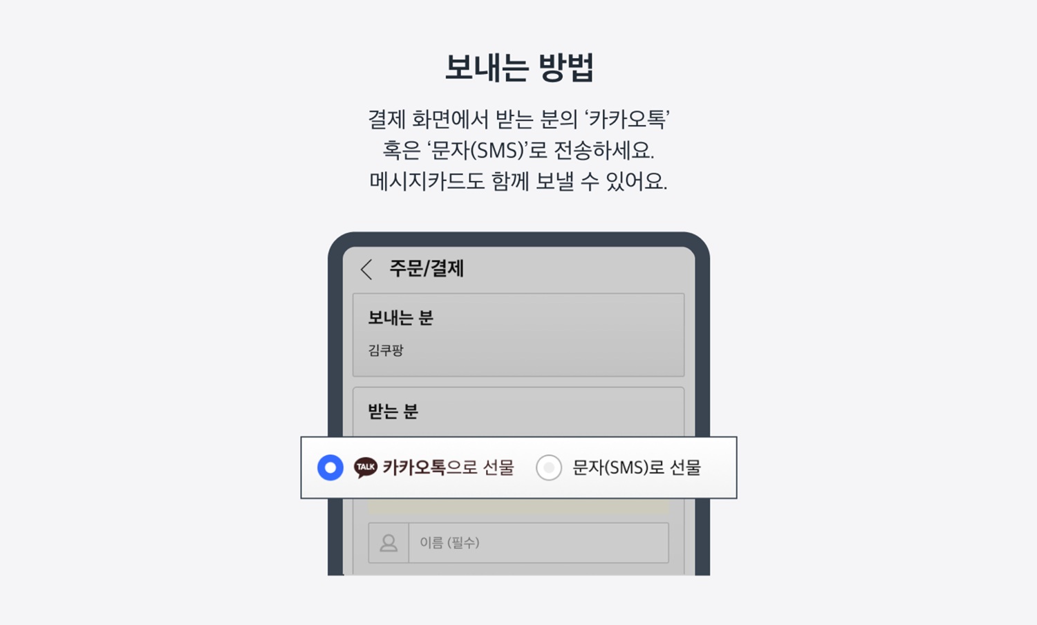 쿠팡에서 ‘쿠팡 기프트카드’를 검색해 상세페이지에 접속하면 기프트카드를 바로 선물할 수 있습니다. 주문/결제 페이지에서 선물 전달 방식을 카카오톡이나 문자 중 선택하고, 메시지카드도 작성할 수 있습니다. 마음을 담은 메시지를 보내보세요!