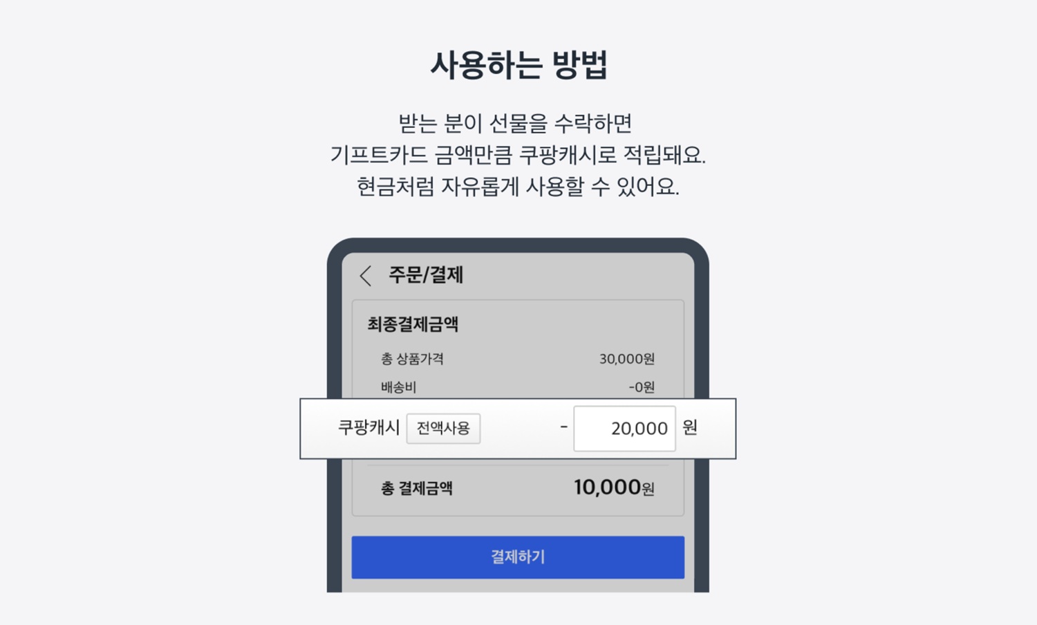 그렇다면 쿠팡 기프트카드는 어디서 구매하고, 어떻게 전달하고, 어떻게 사용할 수 있을까요? 쿠팡 기프트카드의 여정은 누구나 기프트카드를 간편하게 사용할 수 있을 만큼 직관적입니다.