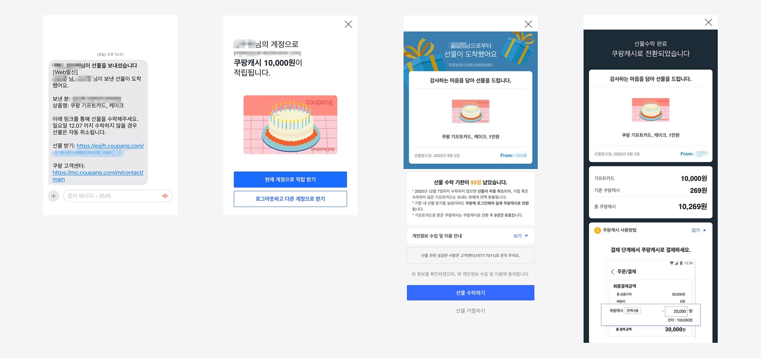 전달받은 메시지 내 ‘선물 받기’ 링크를 누르고 쿠팡에서 ‘선물 수락하기’ 버튼만 누르면 쿠팡 캐시 적립 끝. 이제 그 캐시로 쇼핑하면 됩니다. 적립된 쿠팡 캐시 유효기간은 5년이며, 받는 분이 93일 동안 기프트카드를 수락하지 않거나 거절하면 자동 취소 및 환불되니 참고하세요.