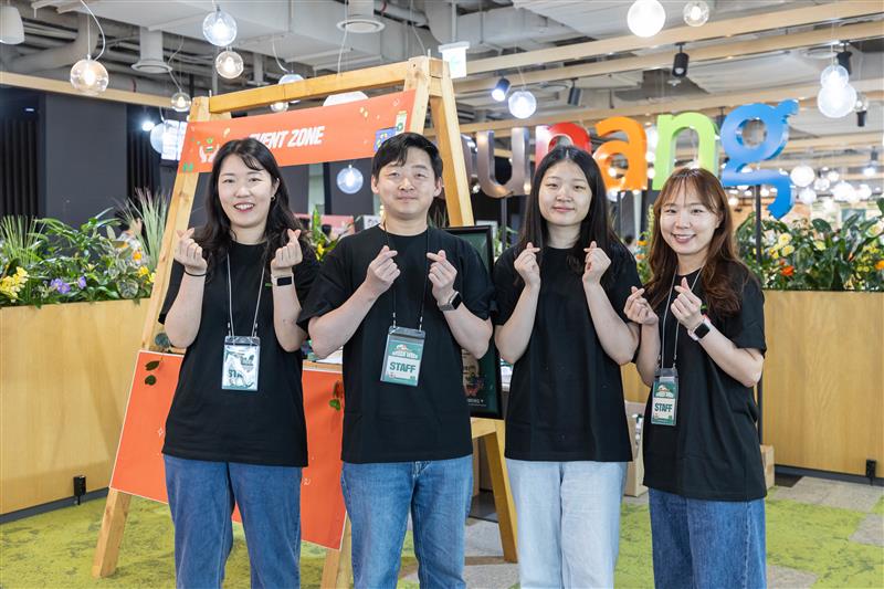 지난 5월 쿠팡 그린위크(ESG 사내캠페인) 행사를 도운 서울여대 프롬미 팀 김다정 학생(오른쪽 두번째)이 CFS ESG 팀 직원들과 기념사진을 찍는 모습.