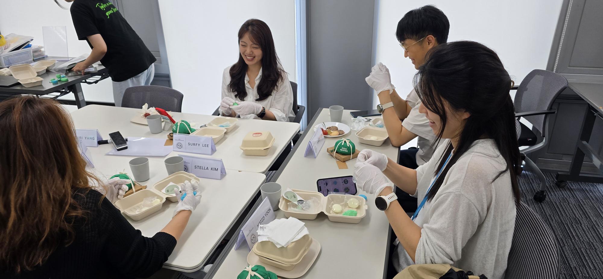 지난 7월 31일 쿠팡 잠실 사옥에서 열린 ESG 캠페인에서, 쿠팡 임직원들이 서울여대 프롬미 팀이 준비한 ‘친환경 미강 비누 만들기 체험’을 하고 있다.