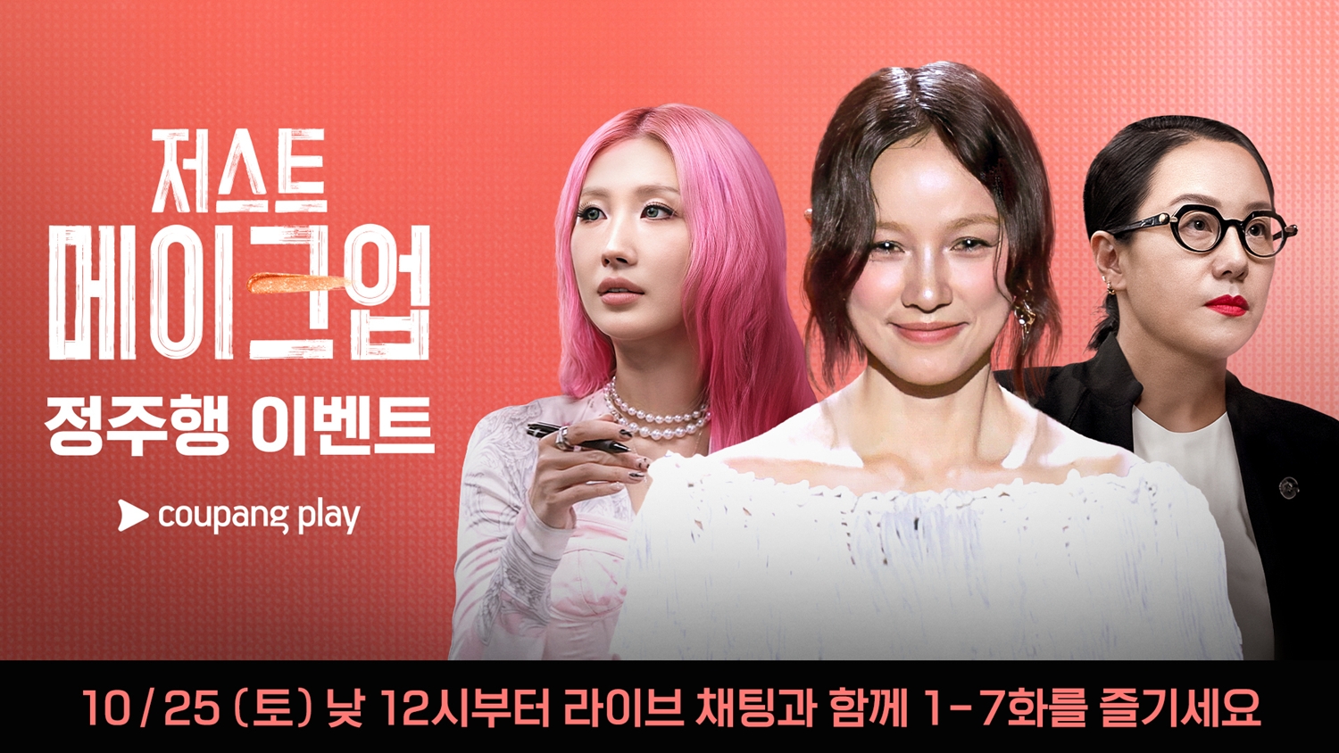 쿠팡플레이 예능 <저스트 메이크업>은 이러한 시청자들의 성원에 힘입어 팬들과 함께하는 정주행 이벤트를 진행한다. 오는 10월 25일(토)부터 11월 8일(토)까지 매주 토요일 낮 12시, 쿠팡플레이 앱에서 열리는 이번 이벤트는, 1화부터 공개된 회차까지 함께 정주행하며, 라이브 채팅으로 실시간 소통할 수 있는 특별한 시간으로 마련된다. 쿠팡 와우회원이라면 누구나 참여 가능하다.