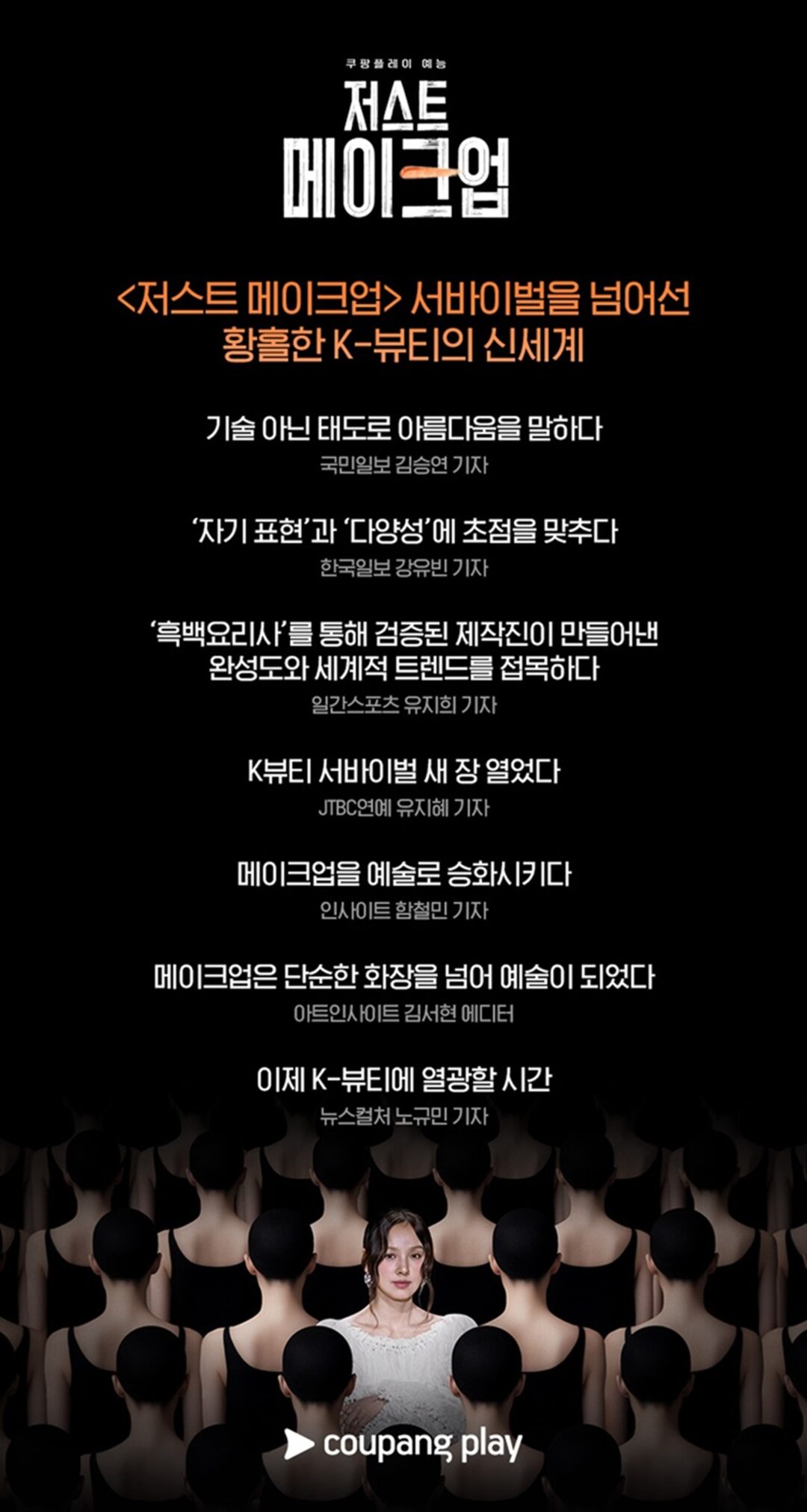 <저스트 메이크업>은 공개 4주차에도 쿠팡플레이 인기작 1위, 예능 콘텐츠 시청 만족도 1위(출처: 컨슈머인사이트) 등을 기록하며 신드롬급 화제를 이어가고 있다. 주요 언론 매체들은 “기술 아닌 태도로 아름다움을 말하다”(국민일보 김승연 기자), “K뷰티 서바이벌 새 장 열었다”(JTBC연예 유지혜 기자), “이제 K-뷰티에 열광할 시간”(뉴스컬처 노규민 기자) 등 호평을 보내고 있다.