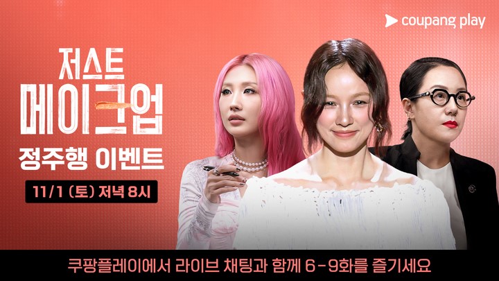 쿠팡플레이 예능 〈저스트 메이크업〉은 바로 오늘 10월 31일(금) 저녁 8시 9화를 공개한다. 쿠팡플레이에서 공개되며 쿠팡 와우회원은 물론 일반회원 누구나 무료로 시청할 수 있다.
