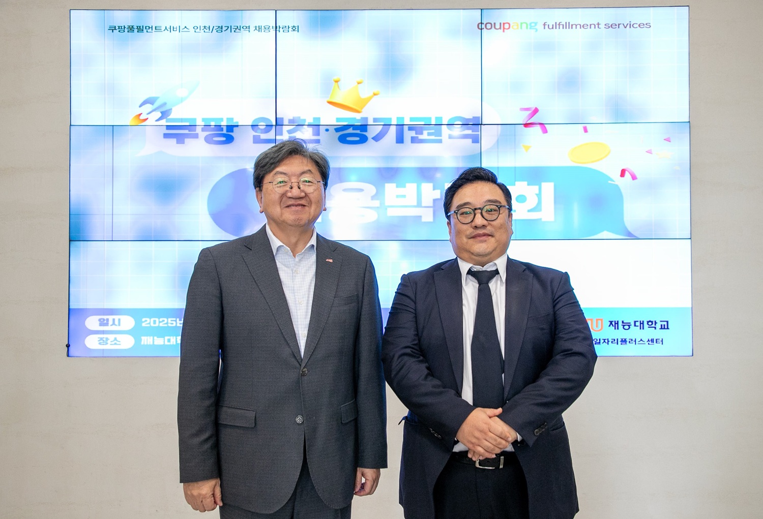 쿠팡풀필먼트서비스 박수현 최고인사책임자(오른쪽)와 재능대학교 이남식 총장이 ‘쿠팡 인천·경기권역 채용박람회’를 기념하고 있다