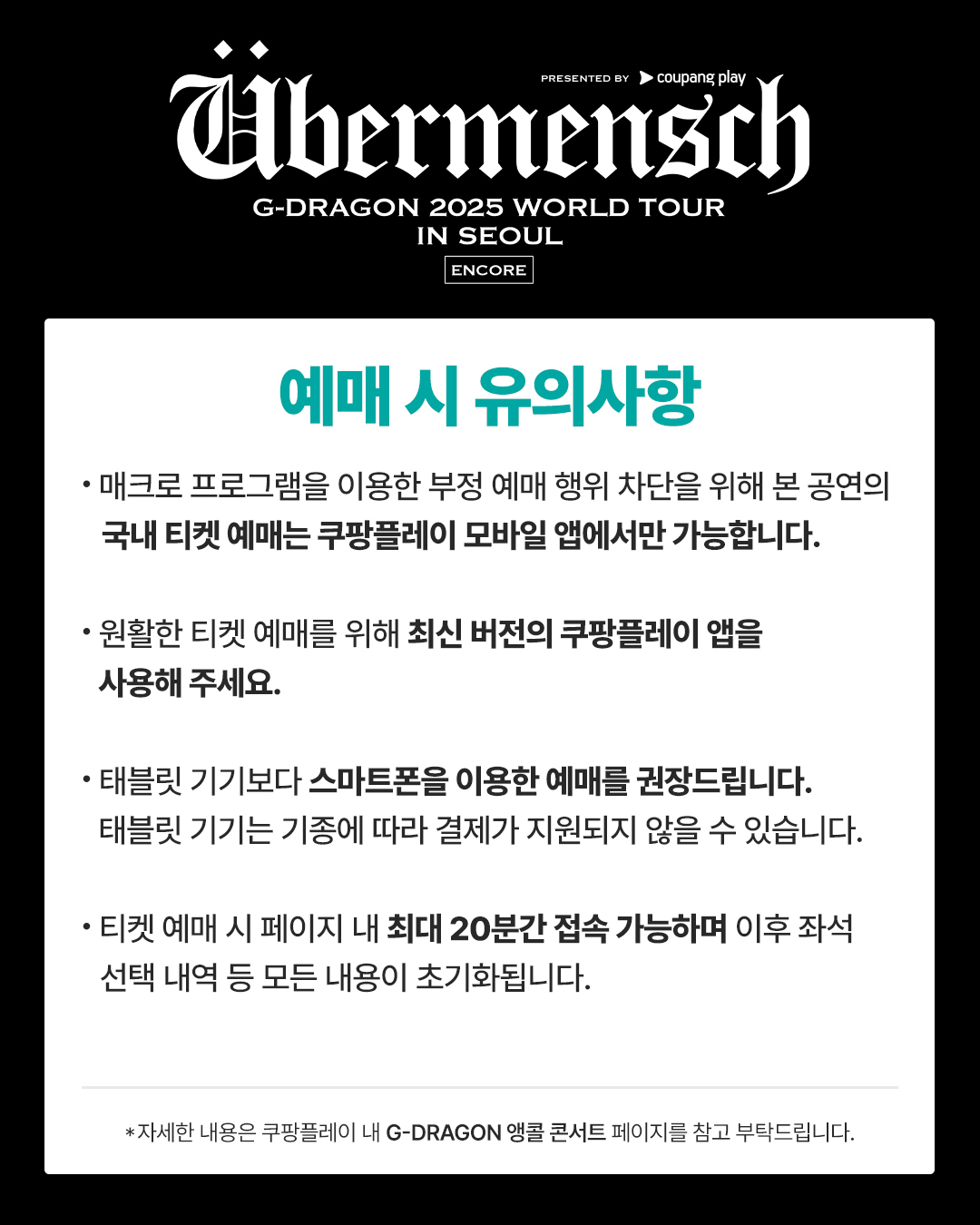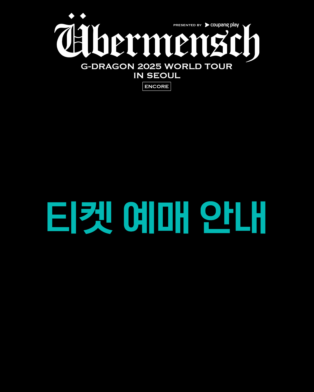 한편, ‘쿠팡플레이와 함께하는 G-DRAGON 2025 월드투어 ‘위버맨쉬’ 인 서울 앵콜’의 티켓 예매 방법 및 공연에 대한 자세한 정보는 쿠팡플레이 공식 웹사이트 및 모바일 앱에서 확인할 수 있다.
