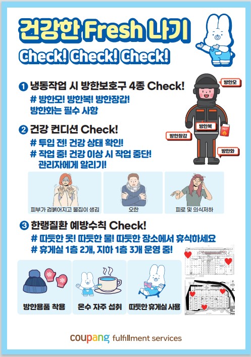 그런가 하면, 이번 캠페인을 기획한 용인 3·5센터 EHS 팀은 직원들에게 한랭질환 예방수칙 등을 안내했습니다. 신선식품을 전문적으로 취급하는 신선센터 특성을 반영한 교육입니다.