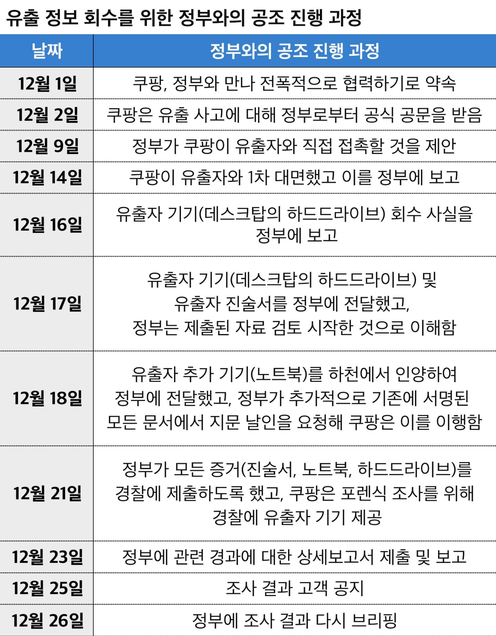 9일, 정부는 쿠팡이 유출자와 접촉할 것을 제안했습니다. 쿠팡은 정부와 협력하여 유출자와의 소통 방향과 단어 선택에 신중을 기했습니다. 이후 쿠팡은 14일 정보 유출자를 처음 만났고, 이 사실을 정부에 보고했습니다. 16일에는 정부의 지시에 따라 정보 유출자의 데스크톱과 하드 드라이브를 1차 회수해 정부에 보고, 제공했습니다. 쿠팡은 하드 드라이브를 정부에 제출한 즉시 정부가 이에 대한 조사에 착수한 것으로 이해하고 있습니다. 당시 정부는 쿠팡에 정보 유출자로부터 추가 기기를 회수해 줄 것을 요청했습니다.