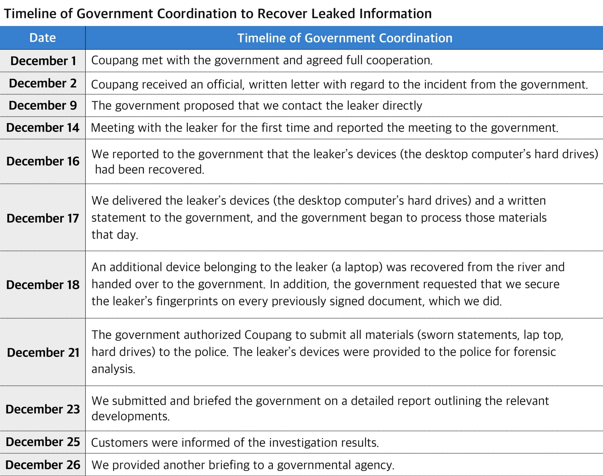 On the 9th, the government suggested that Coupang contact the leaker. Coupang worked with the government on messaging and word choice in its communications. Following this, Coupang met the leaker initially on the 14th and reported this to the government. On the 16th, we completed the primary retrieval of the leaker’s desktop and hard drives as directed by the government, which was then reported. On the 17th, we provided them to the government. Coupang understands that after it delivered the hard drive to the government, the government began an immediate review. The government then requested that we recover additional devices from the leaker.