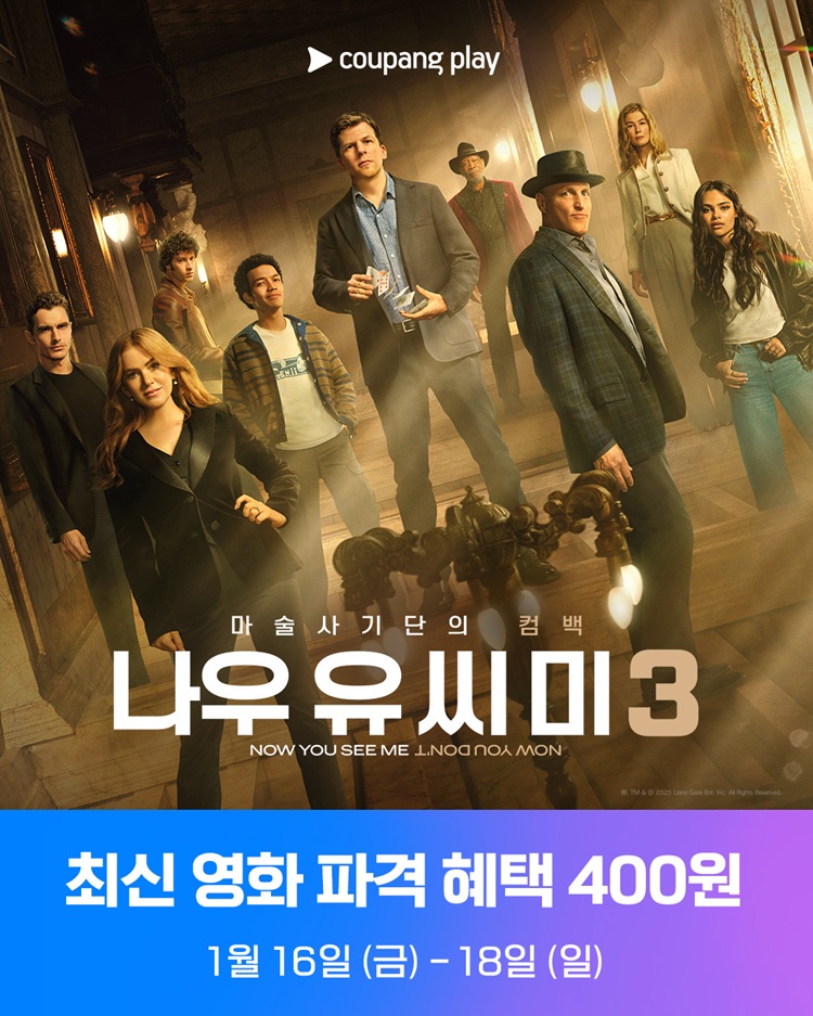 한때 부패한 재벌들을 통쾌하게 농락하던 마술사기단 ‘포 호스맨’. 은퇴 후 각자의 삶을 살고 있던 그들에게 정체불명의 카드가 도착하고, 다시 한자리에 모인 호스맨은 새로운 미션을 부여받는다. 목표는 무기 밀매와 자금 세탁으로 더러운 부를 축적한 재벌 가문의 상징, ‘하트 다이아몬드’를 훔치는 것. 이번 작전에는 포 호스맨을 동경하며 그들을 흉내 내던 신예 마술사들까지 합류한다. 베테랑의 노련한 설계와 신예들의 과감한 감각이 충돌하며, 작전은 예측 불가한 방향으로 흘러간다. 뉴욕, 벨기에, 아부다비, 헝가리까지 세계 각지를 무대로 펼쳐지는 마술 쇼는 한층 커진 스케일과 속도감으로 관객을 끌어당긴다. 쿠팡플레이가 특별히 준비한 <나우 유 씨 미 3>를 시청하고 오리지널 멤버들의 팀 케미, 여기에 더해진 새로운 세대의 에너지를 느껴보자. 전작 <나우 유 씨 미: 마술사기단>, <나우 유 씨 미 2>도 쿠팡플레이에서 함께 만나볼 수 있다.